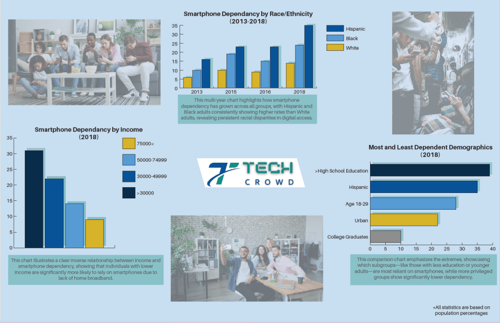 The Tech Crowd Data Analysis infographic was designed to communicate smartphone dependency trends across demographics through clear data visualization. Its purpose is to inform a broad audience—especially students and tech-aware users—about how income, race, and education influence reliance on smartphones. To be effective, the design needed to present complex data in a clear, accessible format. The concept emphasizes contrasts, such as the inverse relationship between income and dependency and disparities across racial groups. Strong hierarchy, consistent color coding, and clear labeling guide the viewer through multiple datasets, while alignment and proximity organize the layout into digestible sections. This artifact represents strong work because it demonstrates both analytical thinking and data storytelling. A unique aspect is the integration of multiple chart types within one cohesive design. Improvements could include refining spacing and increasing text contrast for accessibility, which would enhance readability and overall polish.