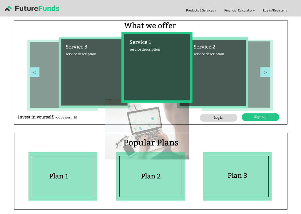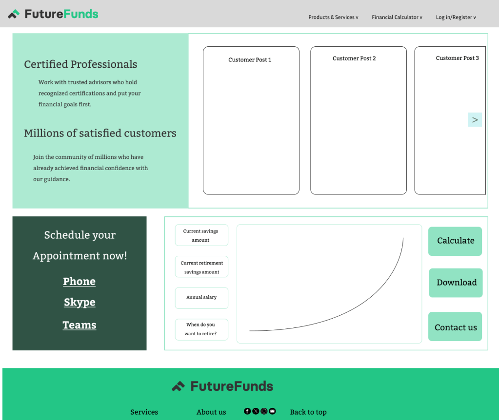 This wireframe design was created for a financial planning website, Future Funds, with the goal of improving usability and clearly presenting services to first-time investors. The layout focuses on simplifying the user experience by prioritizing key features such as service offerings, a financial calculator, and account access. Structured sections like “What We Offer” and “Popular Plans” use hierarchy and visual grouping to guide users through the content while maintaining clarity and ease of navigation. The design emphasizes balance, spacing, and clear call-to-action elements to reduce cognitive overload and build user confidence. This project highlights my ability to identify usability issues and create intuitive, user-centered layouts that effectively communicate information in a clean and organized way.